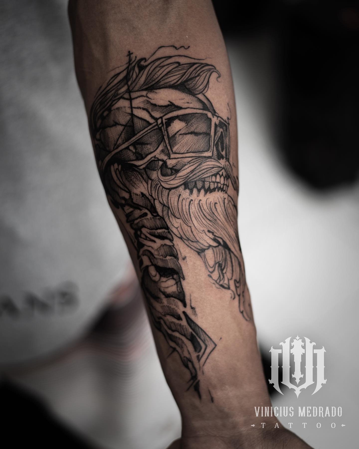 Esta tatuagem disposta verticalmente no antebraço apresenta uma composição alongada que se adapta de forma orgânica à curvatura anatômica do braço. O desenho centra-se em um crânio estilizado com características fortes como cabelo penteado para trás e um conjunto de acessórios que incluem óculos de sol, bigode e uma longa barba fluida. A base da peça é acompanhada por elementos que evocam uma coluna vertebral ou estruturas mecânicas, criando um contraste intricado entre formas orgânicas e geométricas.