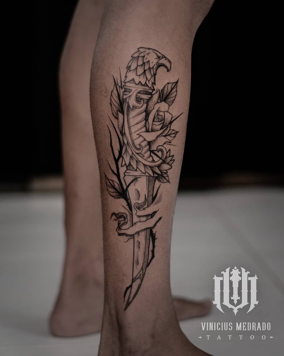Esta tatuagem ocupa a verticalidade da panturrilha com uma composição harmoniosa que acompanha a anatomia da região, valorizando a forma natural do músculo. O elemento central é a adaga, cuja lâmina é envolvida por galhos espinhosos e uma rosa, criando um fluxo visual que guia o olhar de cima para baixo. A cabeça da águia forma o cabo da adaga, estabelecendo um ponto focal robusto e equilibrado com os detalhes delicados da rosa e os espinhos. A fita em laço na parte inferior fecha a composição, oferecendo um contraponto visual e um equilíbrio estrutural, completando o design de forma elegante.