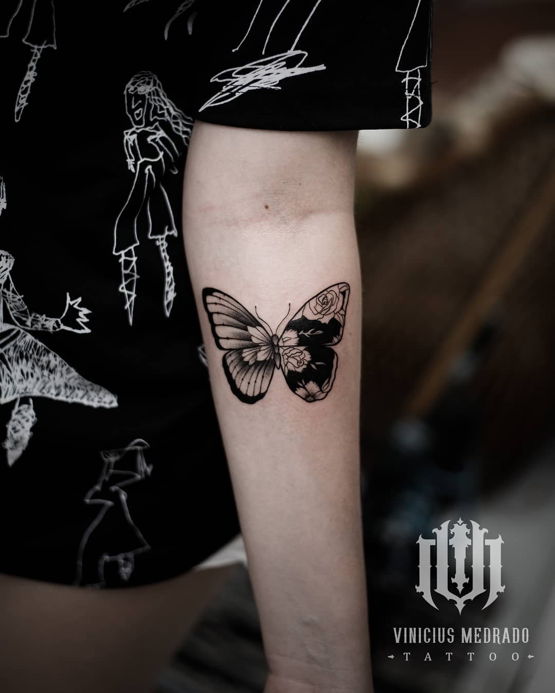 Esta tatuagem apresenta uma composição simétrica e simultaneamente dividida, localizada na região interna do braço. A asa esquerda do inseto segue um padrão clássico de borboleta, destacando-se pelo uso equilibrado de áreas sólidas em preto contrastando com traços finos e delicados na definição dos veios e contornos. A asa direita, em contrapartida, incorpora um delicado arranjo de rosas e folhagens, onde a linha fineline trabalha com precisão para desenhar pétalas e folhas em detalhes minuciosos.
